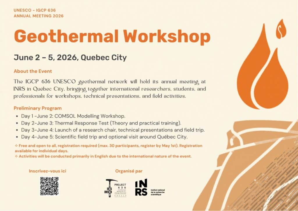 The international research group IGCP 636, under the UNESCO International Geoscience Programme, will hold its annual meeting at INRS in Québec City during a 4-day geothermal workshop from June 2 to 5, 2026.