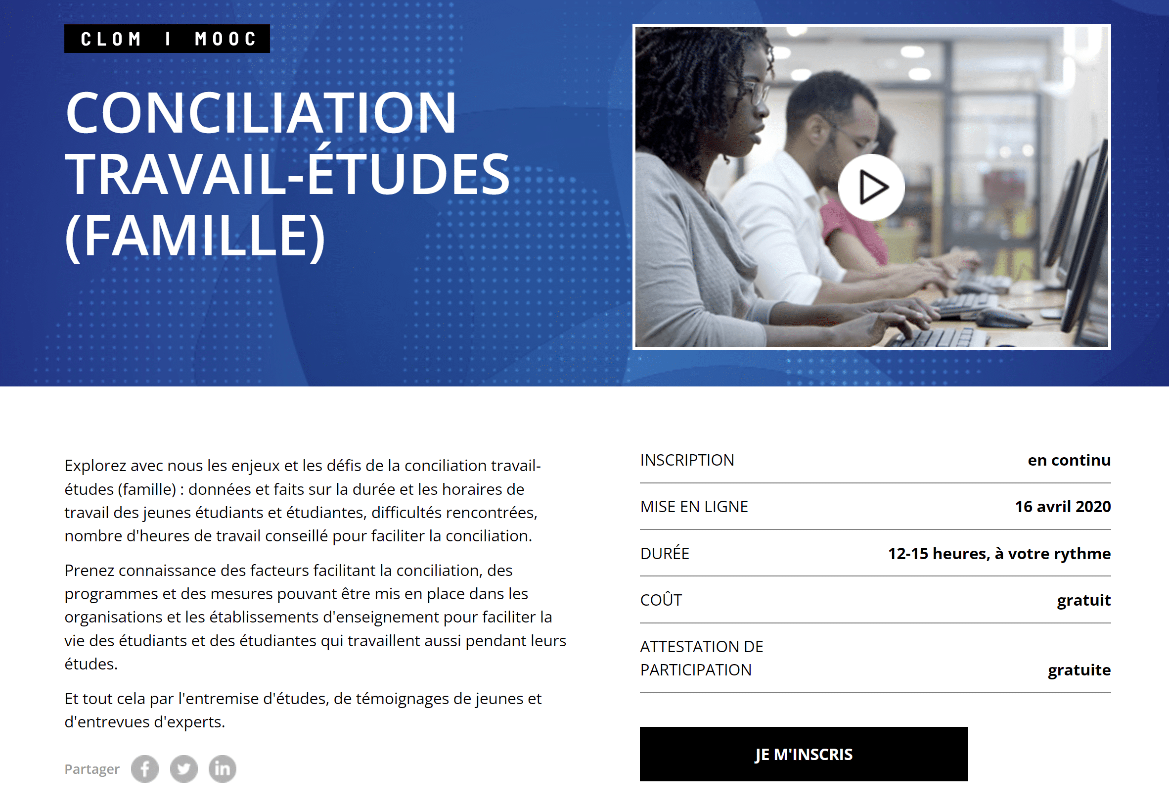 Cours en ligne ouvert sur la conciliation travail-étudesDescriptionCours en ligne ouvert (CLOM, ou MOOC) réalisé avec l’Université TÉLUQ visant à explorer les enjeux et les défis de la conciliation travail-études (famille) ainsi que les facteurs facilitant la conciliation, et des programmes et mesures pouvant être mis en place. Incluant des contenus pédagogiques, ainsi que des entrevues avec des jeunes et des experts, le cours est composé de trois modules qui peuvent être suivis gratuitement en ligne, au rythme souhaité par les participants. Public viséIntervenants et professionnels œuvrant auprès des jeunes, milieu académique, les jeunes eux-mêmes Coconstruction ou partenariatConçu en collaboration avec Diane-Gabrielle Tremblay de l’Université Téluq, dans le cadre des activités du volet Emploi et Entrepreneuriat de la Chaire-réseau de recherche sur la jeunesse du Québec (CRJ). Des membres cochercheurs (Jacques Hamel), étudiants (Émile Fiset) et partenaires (Regroupement des centres d’amitié autochtones du Québec [RCAAQ]) de la CRJ ont contribué à ce cours, en participant à des entrevues. En savoir plus : La conciliation travail-études des jeunes. |