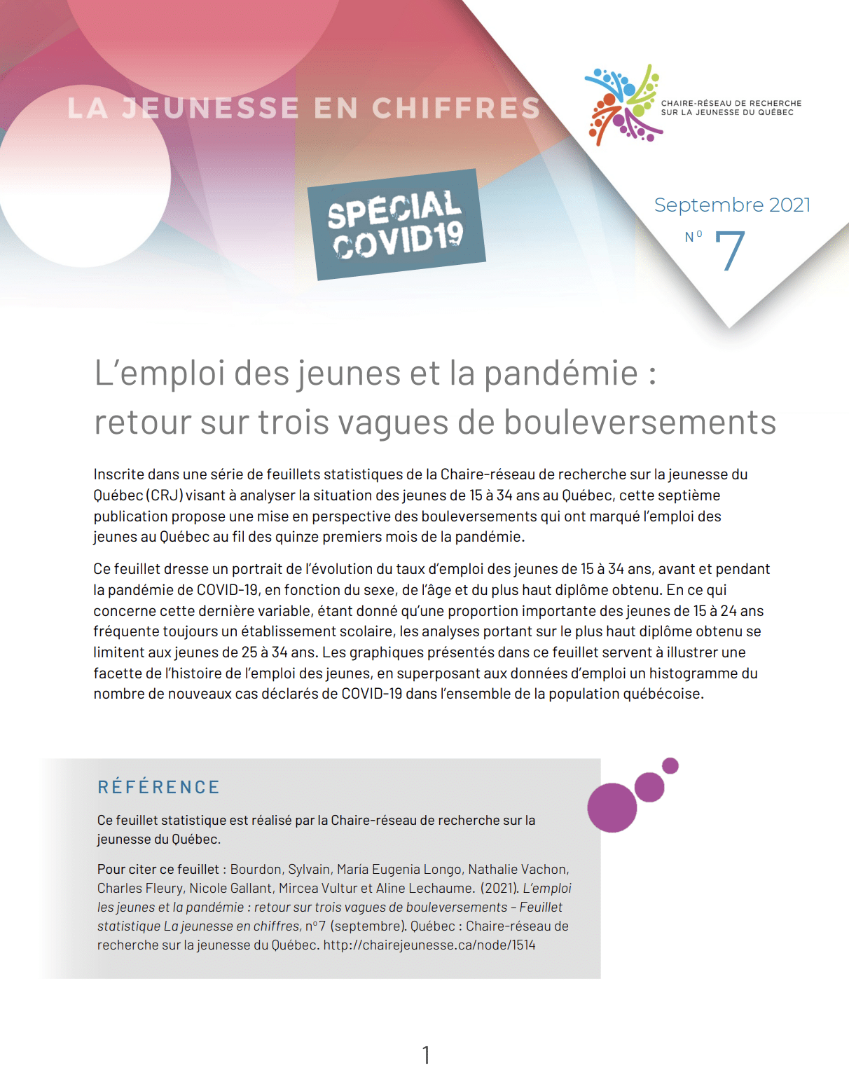 Boutin, É., Coulombe, S., Fleury, C., Bourdon S. et LONGO, M. E. (2021, décembre). La santé psychologique au travail des jeunes en contexte de pandémie (feuillet statistique La jeunesse en chiffres no 9). Chaire-réseau de recherche sur la jeunesse du Québec.Bourdon, S., Longo, M. E., Vachon, N., Fleury, C., Gallant, N., Vultur, M. et Lechaume, A. (2021). L’emploi des jeunes et la pandémie : retour sur trois vagues de bouleversements – Feuillet statistique La jeunesse en chiffres, n° 7 (septembre). Québec : Chaire-réseau de recherche sur la jeunesse du Québec.